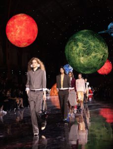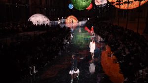 무대 중앙에는 깊고 어두운 반사면의 런웨이가 놓였고, 그 위로 크기와 밝기가 다른 구형 조형물들이 공중에 매달려 있었다. 이 조형물들은 스스로 빛을 발하거나 주변의 조명을 받아 반사하면서, 마치 밤하늘의 행성처럼 공간 속을 떠다니는 듯한 인상을 만들었다. 관객이 어느 각도에서 바라보느냐에 따라 그 배치는 달리 보였고, 런웨이의 반사면은 그 움직임을 그대로 비추며 현실과 반영이 중첩된 시각적 층위를 형성했다.